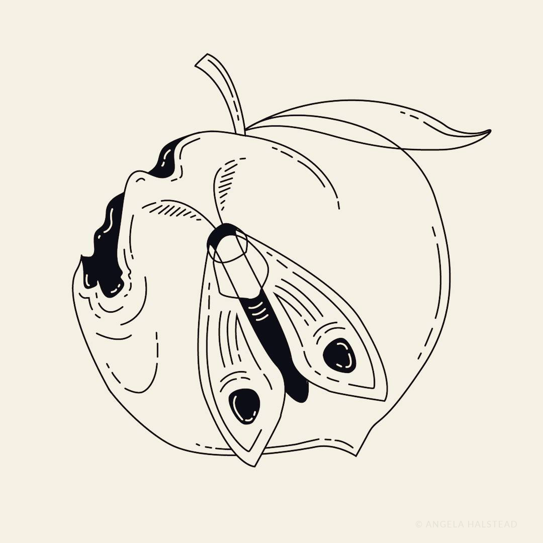 An illustration of a peach and moth from the initial round of cover options.
